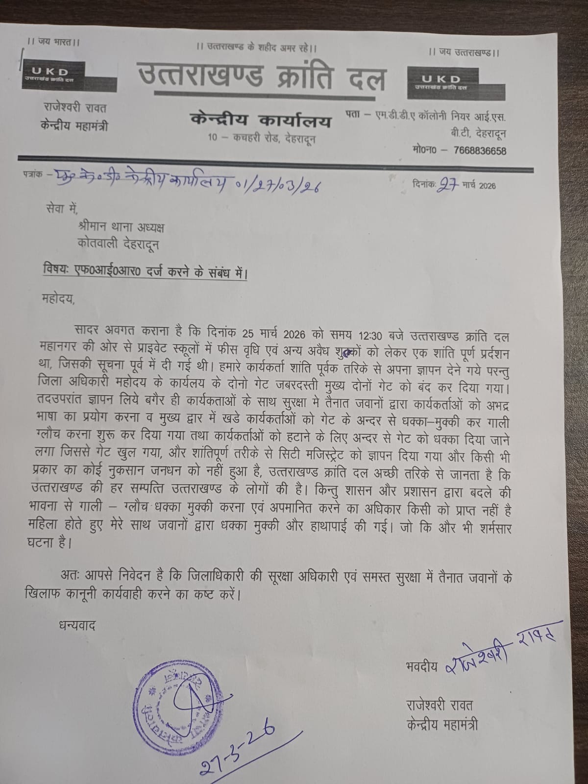 Dehradun: उत्तराखंड क्रांति दल, महानगर, देहरादून द्वारा 25 मार्च 2026 को जिला अधिकारी कार्यालय में एक प्रदर्शन आयोजित किया गया था। इस प्रदर्शन के दौरान, जिलाअधिकारी कार्यालय के सुरक्षा अधिकारी द्वारा दल के कार्यकर्ताओं के विरुद्ध एक झूठी एफआईआर दर्ज की गई है। इस संबंध में, केंद्रीय महामंत्री राजेश्वरी रावत ने जिलाधिकारी कार्यालय के सुरक्षा अधिकारी के खिलाफ कोतवाली में एफआईआर दर्ज कराई है।