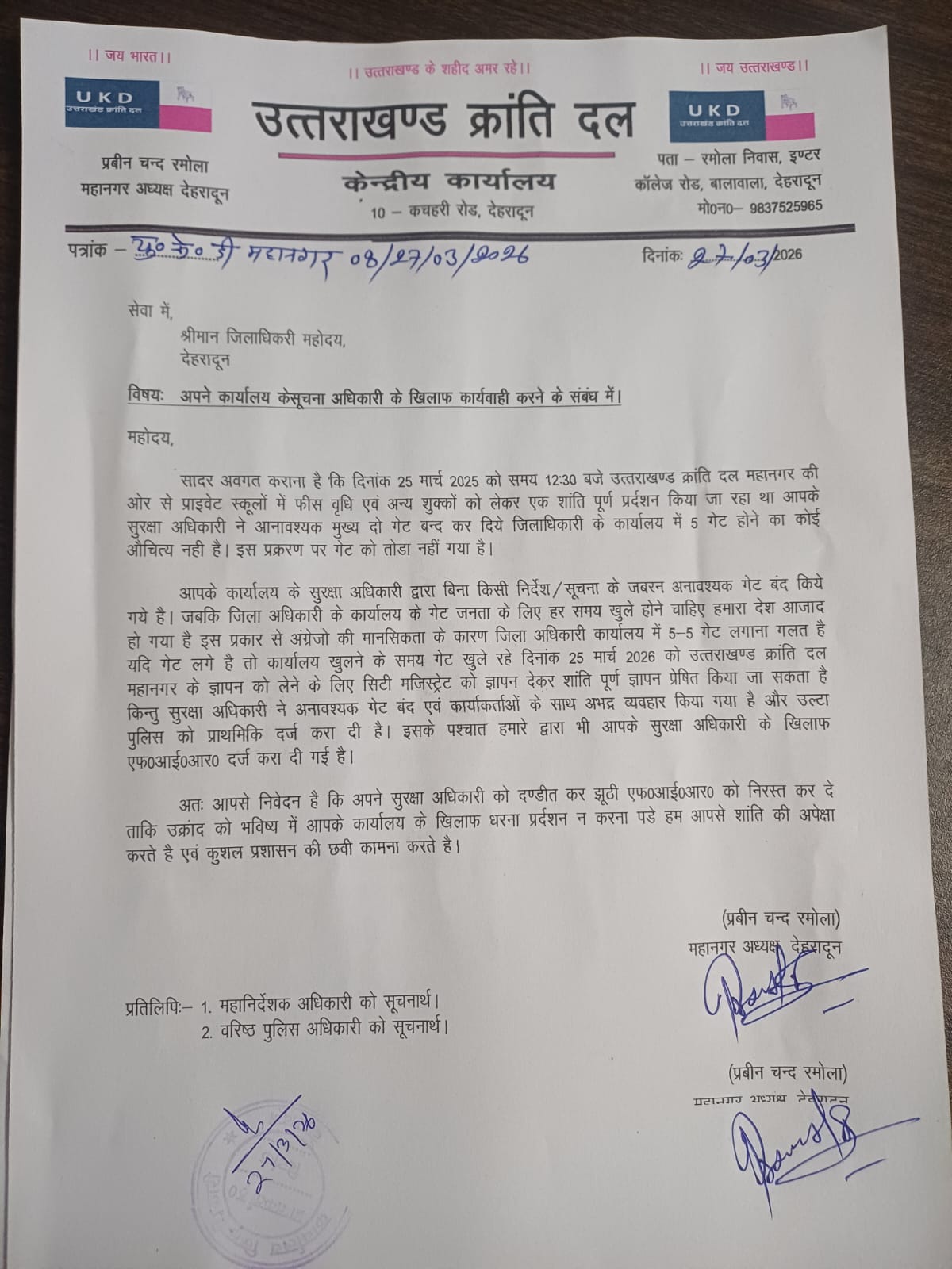 उन्होंने कहा कि उत्तराखंड क्रांति दल शांतिपूर्ण तरीके से अपना ज्ञापन प्रस्तुत करने गए थे, लेकिन जिला अधिकारी कार्यालय में तैनात सुरक्षा अधिकारी ने गेट बंद कर दिया और कार्यकर्ताओं से धक्का-मुक्की की। जबकि जिले की सूचना इकाई ने ज्ञापन शांतिपूर्ण रूप से देने की जानकारी पहले ही दी थी, और महानगर द्वारा भी सूचना प्रेषित की गई थी। महानगर अध्यक्ष प्रबीन चन्द रमोला ने जिलाधिकारी देहरादून को एक पत्र लिखा है, जिसमें उन्होंने कहा कि यदि उत्तराखंड क्रांति दल के कार्यकर्ताओं पर दर्ज झूठे मुकदमे वापस नहीं लिए गए, तो दल इसे किसी कीमत पर बर्दाश्त नहीं करेगा।