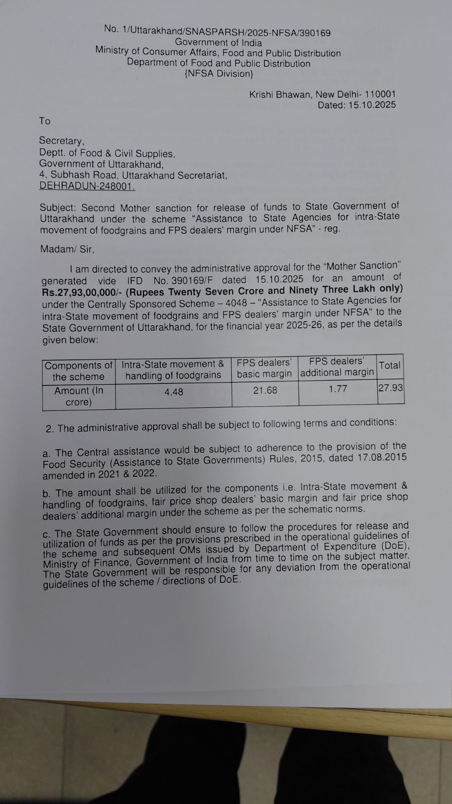 खाद्य, नागरिक आपूर्ति एवं उपभोक्ता मामले की मंत्री रेखा आर्या ने बताया कि प्रदेश को यह धनराशि प्राप्त हो चुकी है और विभाग को निर्देश दिए गए हैं कि इसमें राज्य का हिस्सा जोड़कर शीघ्र ही राशन विक्रेताओं को भुगतान किया जाए।