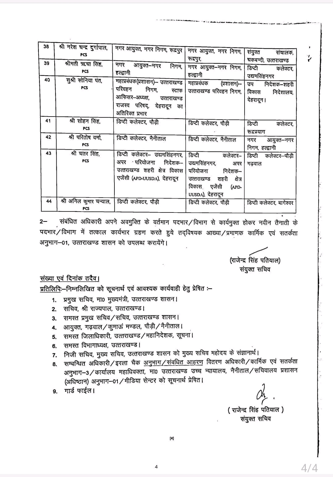 पीसीएस नरेश चंद्र दुर्गापाल को संयुक्त संचालक चकबंदी उत्तराखंड, ऋचा सिंह को डिप्टी कलेक्टर ऊधमसिंह नगर, सोनिया पंत को उप निदेशक शहरी विकास निदेशालय, सोहन सिंह को डिप्टी कलेक्टर रुद्रप्रयाग, परितोष वर्मा को नगर आयुक्त नगर निगम हल्द्वानी, चतर सिंह को डिप्टी कलेक्टर पौड़ी, अनिल कुमार चन्याल को डिप्टी कलेक्टर बागेश्वर के पद पर तैनात किया गया है।