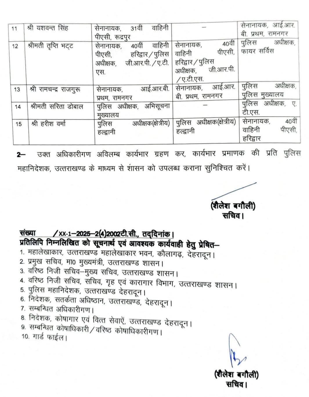 वहीं IPS विमी सचदेवा को पुलिस IG मुख्यालय से हटा दिया गया है। IPS नीरू गर्ग को IG फायर सर्विस बनाया गया। IPS कृष्ण कुमार वीके को IG सीआईडी से हटा दिया गया है। IPS मुख्तार मोहसिन को IG जीआरपी बनाया गया।IPS करण सिंह नग्न्याल को IG कारागार बनाया गया है। IPS अरुण मोहन जोशी को IG एसडीआरएफ से हटा दिया गया है। IPS नीलेश आनंद भरणे को IG PAC बनाया गया है। IPS सुनील कुमार मीणा को IG जीआरपी से हटा दिया गया है। IPS योगेंद्र सिंह रावत को आईजी पुलिस मुख्यालय बनाया गया है। IPS निवेदिता कुकरेती को DIG एसडीआरएफ बनाया गया है। IPS यशवंत सिंह को कमांडेंट आईआरबी प्रथम रामनगर बनाया गया है। IPS तृप्ति भट्ट को SP फायर सर्विस का अतिरिक्त प्रभार दिया गया है। IPS रामचंद्र राजगुरु को SP पुलिस मुख्यालय बनाया गया है। IPS सरिता डोभाल को SP एटीएस बनाया गया है। IPS हरीश वर्मा को कमांडेंट 40वीं वाहिनी पीएसी बनाया गया है। IPS तृप्ति भट्ट को अपर सचिव गृह एवं कारागार बनाया गया है।