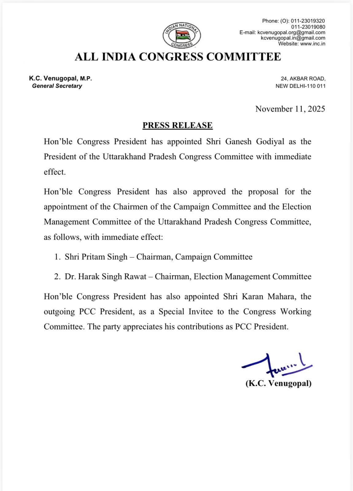 Uttarakhand: कांग्रेस हाईकमान ने पूर्व विधायक गणेश गोदियाल को प्रदेश कांग्रेस कमेटी का नया अध्यक्ष नियुक्त किया है। कांग्रेस महासचिव के सी वेणुगोपाल ने नियुक्ति के आदेश जारी कर दिए हैं।