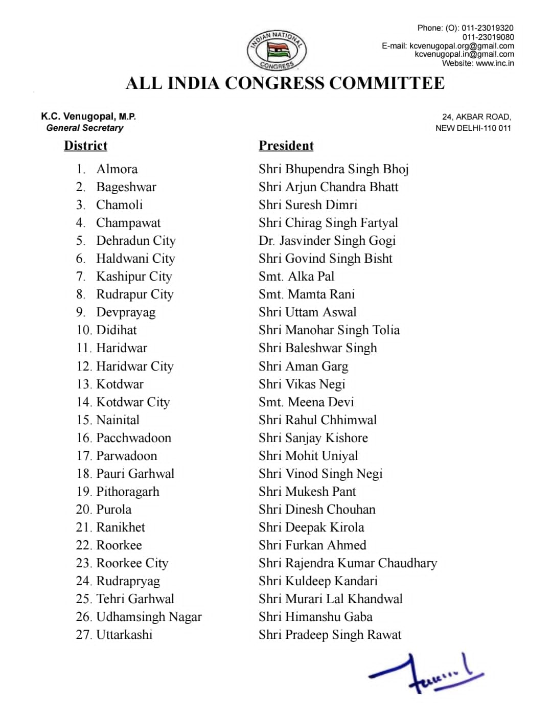 इसके साथ ही चकराता विधायक प्रीतम सिंह और पूर्व कैबिनेट मंत्री व कांग्रेस नेता डॉ. हरक सिंह रावत को भी बड़ी ज़िम्मेदारी सौंपी है। हाईकमान ने प्रीतम सिंह को प्रचार समिति का अध्यक्ष और डॉ. हरक सिंह रावत को चुनाव प्रबंधन समिति का अध्यक्ष नियुक्त किया है। साथ ही कांग्रेस के जिलाध्यक्षों की घोषणा की गई।