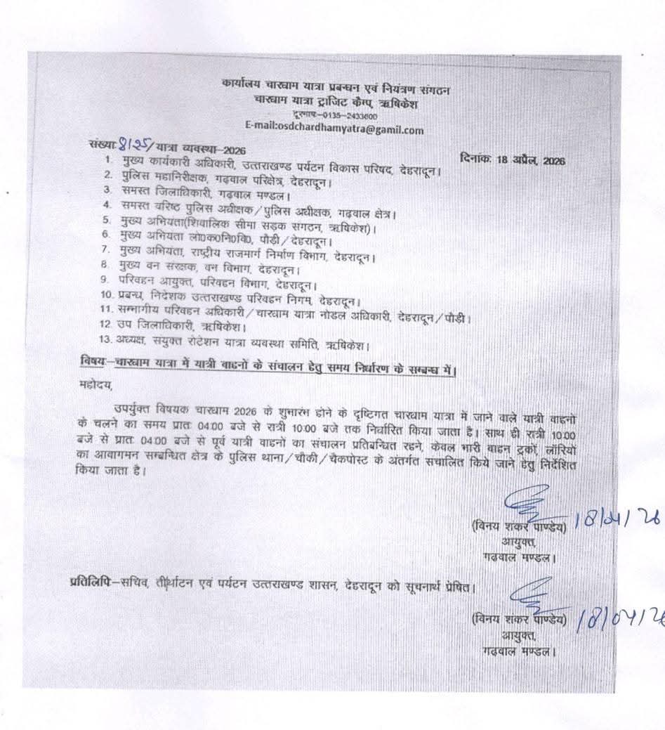 विनय शंकर पांडे आयुक्त गढ़वाल मंडल के निर्देशों के तहत यात्रा मार्गों पर यात्रियों के वाहनों का संचालन सुबह 4 बजे से रात्रि 10 बजे तक निर्धारित किया गया है।* रात्रि 10 बजे से सुबह 4 बजे तक यात्री वाहनों का संचालन यात्रा मार्ग पर प्रतिबंधित रहेगा और केवल भरी वाहन जैसे ट्रक , लॉरियो का आवागमन संबंधित क्षेत्र के पुलिस थाना / चौकी/ चेकपोस्ट के अंतर्गत संचालित किया जाएगा। इस दौरान सुरक्षा एवं यातायात व्यवस्था को सुदृढ़ बनाए रखने के लिए पुलिस, प्रशासन तथा संबंधित विभागों को समन्वय के साथ कार्य करने के निर्देश दिए गए हैं।