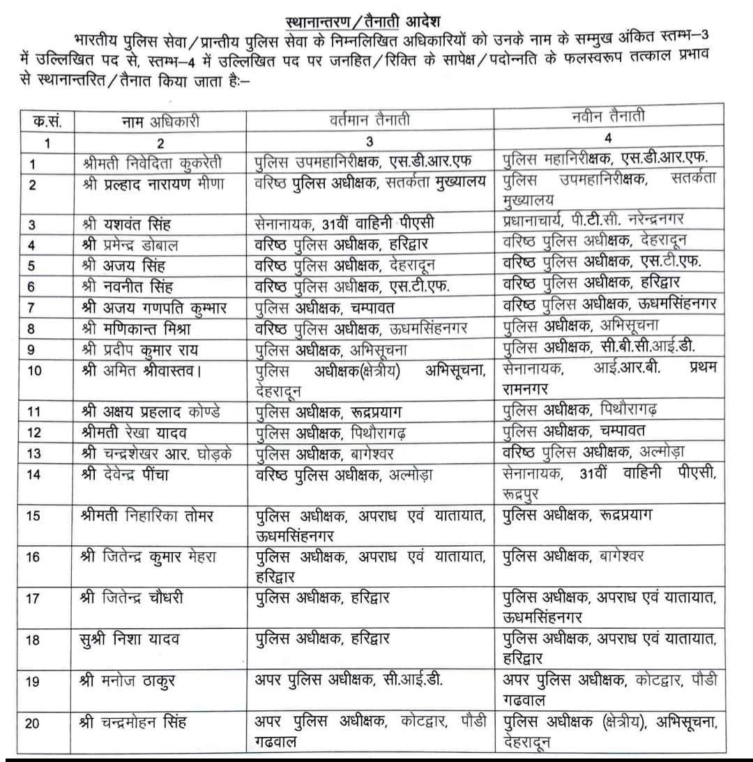 जितेंद्र चौधरी को पुलिस अधीक्षक हरिद्वार से अपराध एवं यातायात ऊधम सिंह नगर तथा निशा यादव को पुलिस अधीक्षक हरिद्वार से अपराध एवं यातायात हरिद्वार की जिम्मेदारी दी गई है।