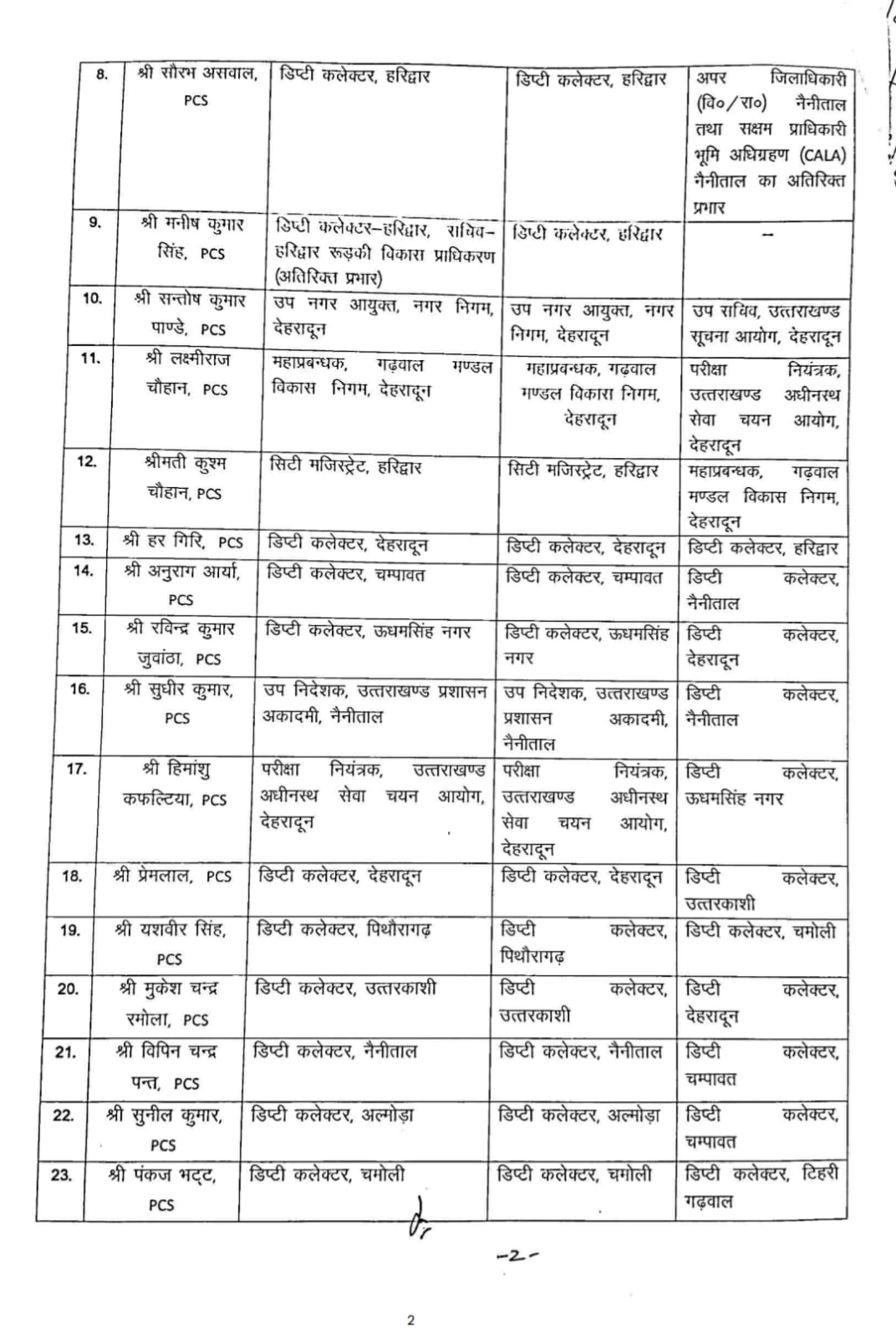 वहीं, शिवकुमार बर्नवाल को हर्रावाला स्थित आयुर्वेद विश्वविद्यालय का रजिस्ट्रार बनाया गया है। सौरभ असवाल अब नैनीताल के नए एडीएम (ADM) होंगे। टिहरी और नैनीताल जैसे महत्वपूर्ण जिलों के एडीएम भी इस फेरबदल का हिस्सा रहे हैं।